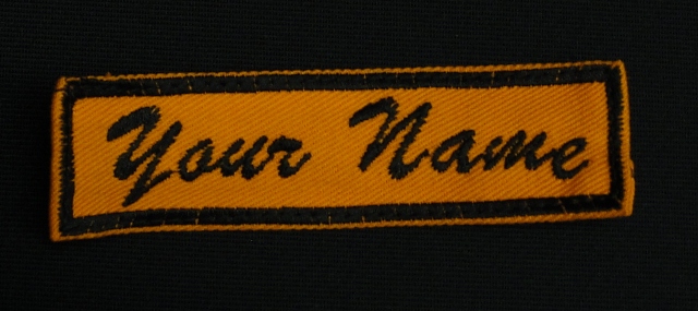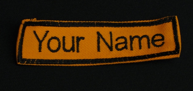 Embroidered Name (Black) on Orange Proban Fabric.